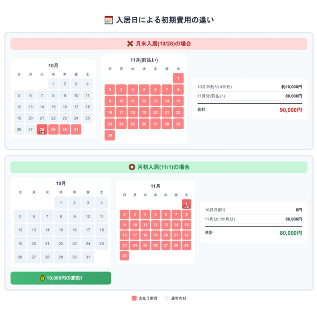 たとえば、月末に入居すると1か月分+日割り分の家賃がかかりますが、翌月1日に入居すれば1か月分のみで済み、数万円の節約になります。